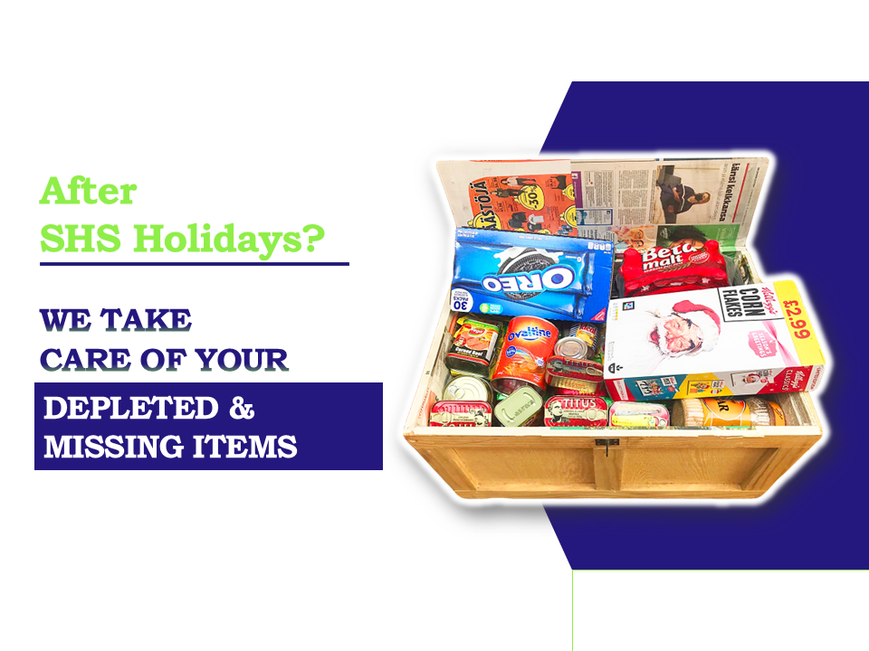 This service is available to SHS students after vacation and mid-term holidays, who need items to replace depleted and misplaced items in school. Customers can utilize this service by ordering for all their essential items and Provistore Limited will deliver their orders to them at home or in school.