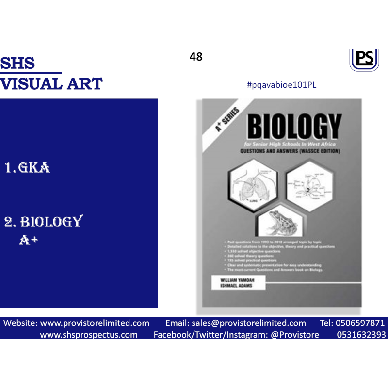 Enhance your academic achievements with A+ Series WASSCE Visual Art with Biology Elective Subjects Past Questions & Answers for Senior High School by Mr. Ishmael Adams and Others. These are comprehensive senior high school Past Questions and Answers books accumulated from 1993 to the current year or years prior and sectionalized into their respective topics in the field of the listed subjects. This essential guide offers detailed explanations and expert tips to help students grasp key concepts and succeed in the listed subjects. Whether preparing for exams or aiming to deepen understanding, these books are the must-have for senior high school students. Order now to access premium study materials and elevate your learning experience.